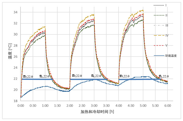 在分析曲線如圖2,圖3和圖4中,并收集結(jié)果,在一個(gè)溫度(22℃)中選擇,清楚地表明不同相變材料的影響活性炭中的量上的周期時(shí)間長度與發(fā)生個(gè)體樣品中的熱交換過程。相對(duì)于溫度傳感器的更高的質(zhì)量和熱容量,即使吸附的相變材料的量很小,也可以看到處理時(shí)間的差異。當(dāng)與參比樣品(I),沒有相變材料,總的冷卻和加熱時(shí)間的所有樣品與相變材料的不同水平長。對(duì)于樣品V,此時(shí)間延長了7.5%,對(duì)于樣品IV,延長了5.2%,對(duì)于III,延長了2.4%,對(duì)于樣品II(未活化的活性炭),僅延長了0.2%。