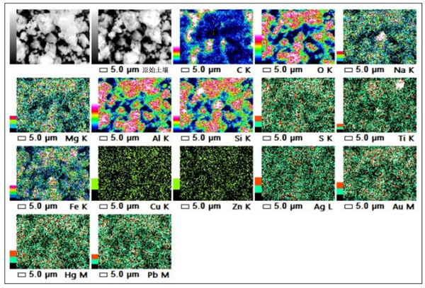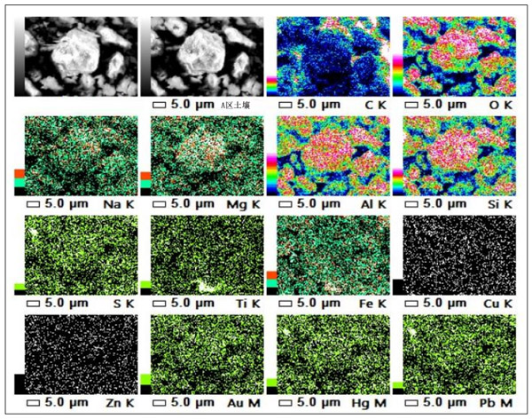 SEM-EDS測試使用了三個樣本,即A區(qū)域樣本,B區(qū)域樣本和原始土壤樣本。分析了這三個樣品。尋找的參數(shù)是充當(dāng)污染物的重金屬元素。該測試的結(jié)果顯示了土壤中存在的元素的質(zhì)量百分比。掃描電鏡是一種用于表面觀察的工具,其焦點深度大于光學(xué)顯微鏡,可以直接觀察復(fù)雜的表面而無需復(fù)制。SEM圖像顯示出樣品的形態(tài)狀態(tài),顯示出大小不規(guī)則的團塊。同時,EDS分析非常適合揭示樣品中的化學(xué)元素和化合物。EDS的元素映射將為對象表面上的每個元素賦予不同的顏色,并定量分析每個元素的百分比。