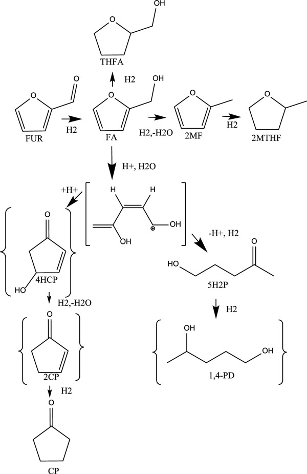 在下一組實(shí)驗(yàn)中,確定了液體停留時(shí)間對(duì)糠醛加氫超過(guò)0.8%活性炭催化劑的影響(H 2氣流保持恒定在100 mL/min)。糠醛轉(zhuǎn)化率隨著液時(shí)空速的增加或停留時(shí)間的縮短而下降,碳封閉率在74%至100%之間。溫度,壓力和液體停留時(shí)間效應(yīng)研究的結(jié)果表明,活性炭催化劑主要通過(guò)糠醛促進(jìn)了糠醛中糠醇和2-甲基呋喃的形成,并通過(guò)推測(cè)性反應(yīng)途徑促進(jìn)了環(huán)戊酮和5-羥基-2-戊酮的少量形成,需要對(duì)酮進(jìn)行酸催化)形成(圖3)。