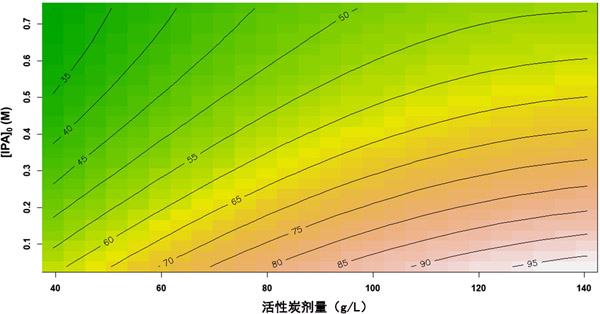 圖2:過(guò)氧化氫濃度和初始異丙醇濃度的相互作用效應(yīng)及其對(duì)總有機(jī)碳去除率的影響;钚蕴康膭┝勘3趾愣ㄔ90 g/L。