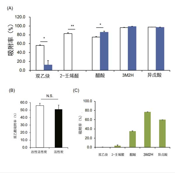 我們測(cè)試了活性炭對(duì)五種散發(fā)惡臭的揮發(fā)性有機(jī)化合物的吸附能力。發(fā)現(xiàn)活性炭對(duì)二乙;2-壬烯醛的吸附水平均高于氧化鋅。但是,與醋酸氧化鋅相比,活性炭的吸附效果略低(圖3A)。相反,活性炭和氧化鋅對(duì)3M2H和異戊酸的吸附能力之間沒(méi)有顯著差異。為了比較活性炭和改性活性炭中所含活性炭的吸附能力,使用無(wú)法吸附在二氧化鈦上的二乙;鶞y(cè)試了相同量活性炭中的吸附水平。發(fā)現(xiàn)與活性炭相比,改性活性炭的吸附能力沒(méi)有顯著變化(圖3B)。