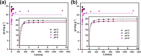 圖2:通過(guò)非線性(a)偽一階模型和(b)偽二階模型擬合在4、2、4、6和8的四個(gè)不同溶液pH下的實(shí)驗(yàn)吸附動(dòng)力學(xué)數(shù)據(jù)。實(shí)驗(yàn)數(shù)據(jù)用點(diǎn)表示,等溫線擬合用虛線表示。