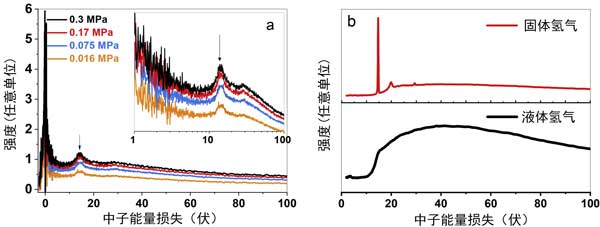 在非彈性中子散射實(shí)驗(yàn)中,使用普通氫在三個碳原子上的原位氫劑量(圖2)。圖2a顯示了鈦活性炭中氫氣在0.3MPa壓力下的INS光譜,表明在0meV處有清晰的峰歸因于固定(固態(tài))和部分移動(液態(tài))氫的彈性和準(zhǔn)彈性散射。在圖2中以對數(shù)能量軸查看的光譜a顯示了在不同壓力負(fù)載下,活性炭上吸附的H2在14.7meV處的旋轉(zhuǎn)峰。我們先前在石墨活性炭上出現(xiàn)轉(zhuǎn)子峰的情況,該峰對應(yīng)于固體中從對向或從正向旋轉(zhuǎn)躍遷的氫。14.7meV峰的存在表明氫分子處于以下狀態(tài):它們在三個維度上固定并且表現(xiàn)為自由轉(zhuǎn)子,因此近似于固體。