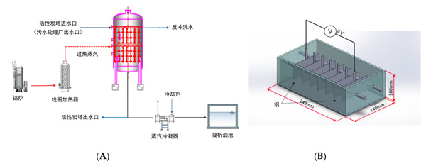 建造了一個用于微塑料去除實驗的中試規(guī)模的設(shè)施,該設(shè)施由帶有熱再生系統(tǒng)的活性炭塔組成。該設(shè)備在接觸塔中運行時的總質(zhì)量約為800千克活性炭。這個設(shè)施是由活性炭單元和過熱蒸汽單元組成的可熱再生裝置。該活性炭塔系統(tǒng)是在污水處理廠上建立的,收集污水樣本以進(jìn)行微塑料分析。如圖所示圖1A,蒸汽鍋爐中產(chǎn)生高于100℃的飽和蒸汽,并通過管線加熱器轉(zhuǎn)換為500-700°C的過熱蒸汽。蒸汽過熱進(jìn)行熱解過程,是由轉(zhuǎn)換后的過熱蒸汽通過塔內(nèi)的輻照管噴嘴在有效半徑內(nèi)噴灑到活性炭上,并提高了活性炭的溫度。通過噴灑500-700°C的過熱蒸汽來蒸發(fā)活性炭孔中的水分,并且通過無氧低溫將吸附的一氧化碳或二氧化碳和低分子量化合物與有機物和微塑料分解為水。此時,將未分解的未溶解的低分子量有機化合物與冷凝水混合,并返回到污水處理廠的進(jìn)水口。從活性炭再生裝置下部排出的蒸汽由熱交換器冷卻,然后引入冷凝水儲罐,并返回到污水處理廠進(jìn)水或進(jìn)行后處理。