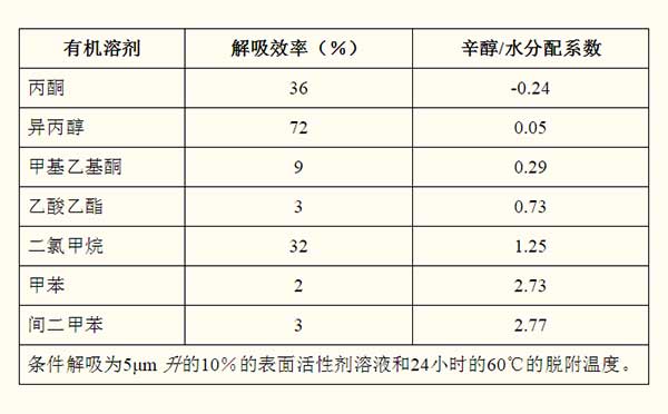 七種有機(jī)溶劑解吸效率表示與圖1。實(shí)驗(yàn)條件5米升的10%的表面活性劑溶液和60℃24個小時解吸溫度。的有機(jī)溶劑的解吸效率是3%,72%,9%,3%,32%,2%,而對于丙酮,異丙醇,甲基乙基酮,醋酸乙酯,二氯甲烷,甲苯,和3%的米二甲苯。