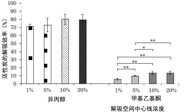 如示于圖2所示,異丙醇的解吸效率不會受表面活性劑濃度。然而,在甲基乙基酮中,當(dāng)表面活性劑濃度增加至10%時,解吸效率增加。表面活性劑的去污力和增溶能力都有助于有機(jī)溶劑從活性炭中解吸附。